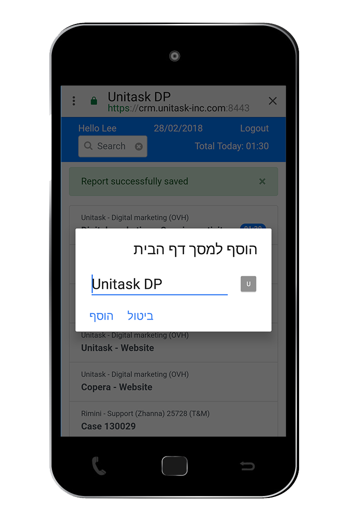 כתבו תיאור קצר של מה שנעשה במשימה, והזינו את מספר השעות בעזרת לחצני השעות – כל לחצן מוסיף את הזמן הרשום עליו. ניתן להגיע לדיוק של עד 15 דקות: